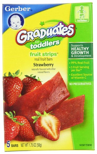 Gerber Graduates Fruit Strips, Strawberry helps moms to have another option to help their toddler achieve the recommended fruit servings per day. Designed specially for toddlers, each fruit strip is an excellent source of vitamin C and contains a half serving of fruit. moms have another option to help their toddler achieve the recommended fruit servings per day. Designed specially for toddlers, each fruit strip is an excellent source of vitamin C and contains a half serving of fruit.